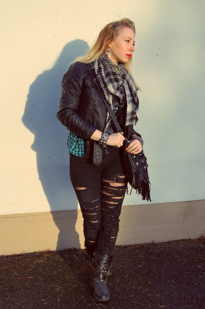With this look, I was kind of playing with the grunge trend, not going full grunge, but still. I don't (yet) own a pair combat boots, and didn't feel like sneakers, so I went for biker boots. And naturally, some leather, plaid and ripped jeans just had to be combined.