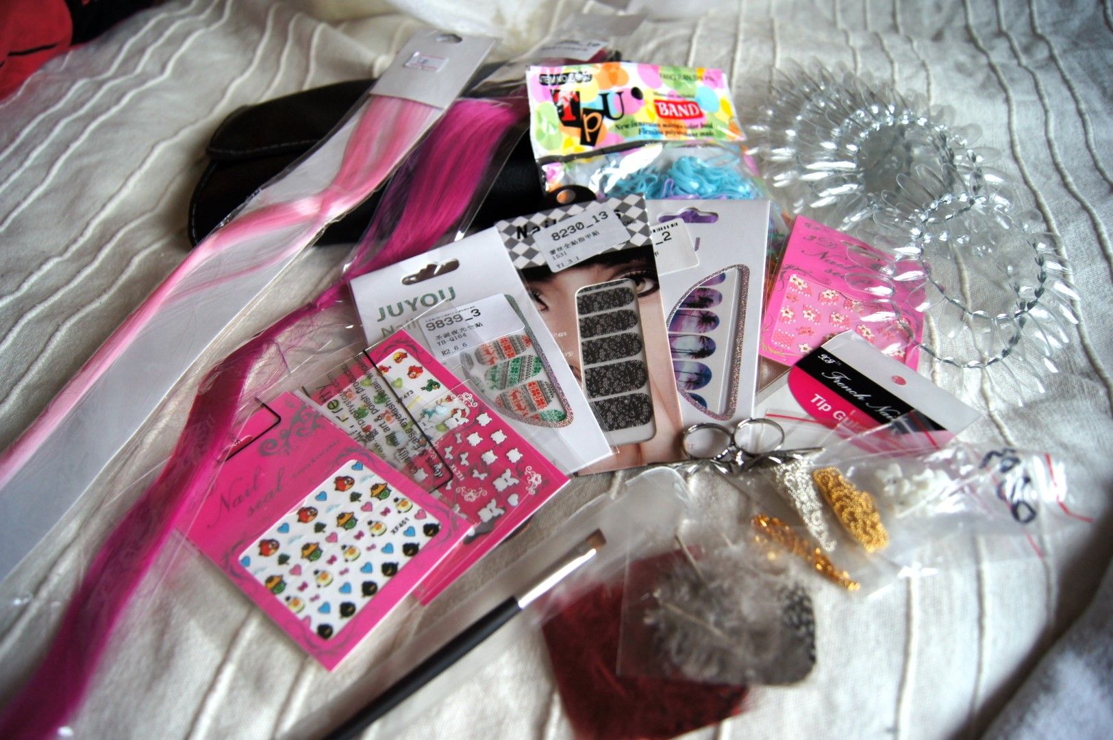 Some hair stuff, clip on stripes in cute colors and little rubber bands for braiding.