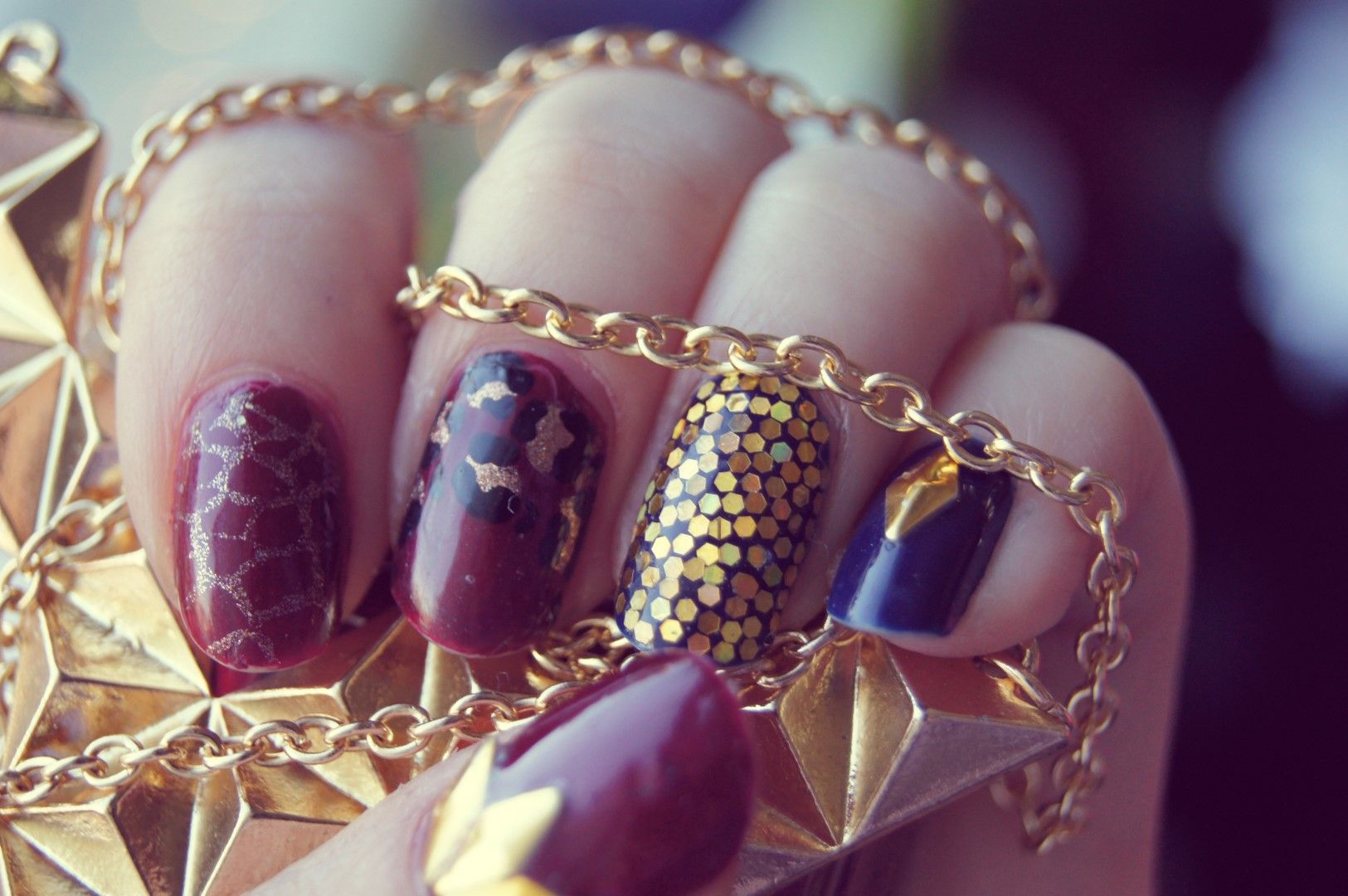 First up is this pretty detailed burgundy-gold-navy mani I created last month. And it's appropriately shot with a golden jewelry, haha.