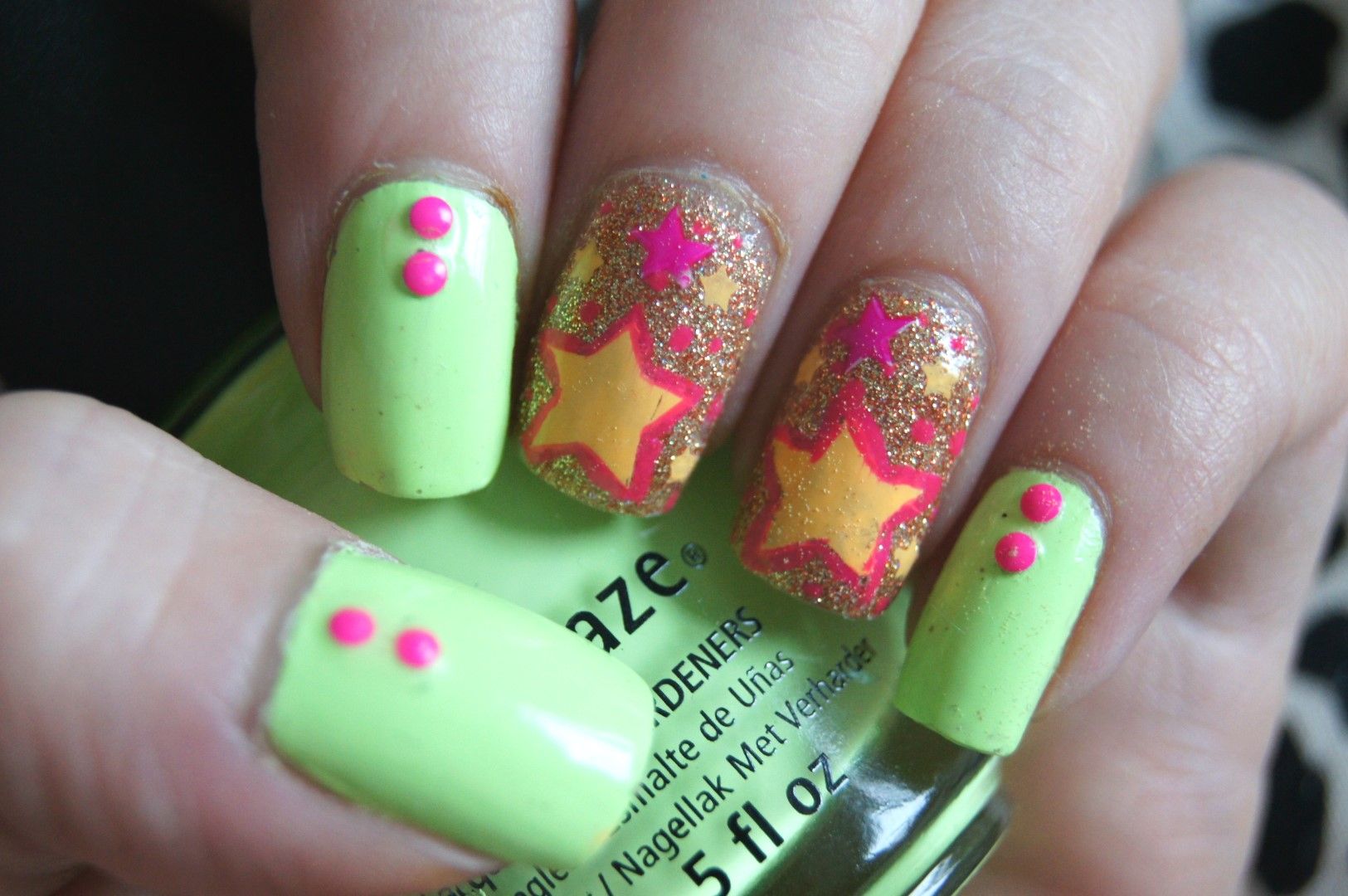 The polishes I used were China Glaze Grass Is Lime Greener, I Herd That and Sun Of A Peach. The pink one is a nail art thingy by Kiss.