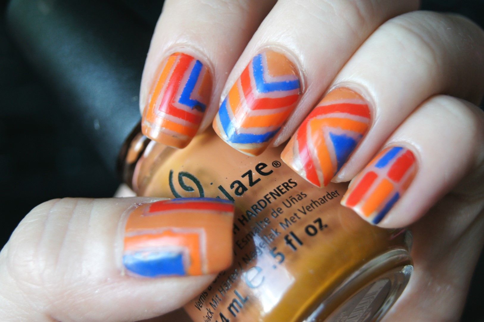 The polishes I used are all by China Glaze: Desert Sun, Stoked To Be Soaked, Roguish Red and I Sea The Point. And, as mentioned, the patterns were made with the help of striping tape.