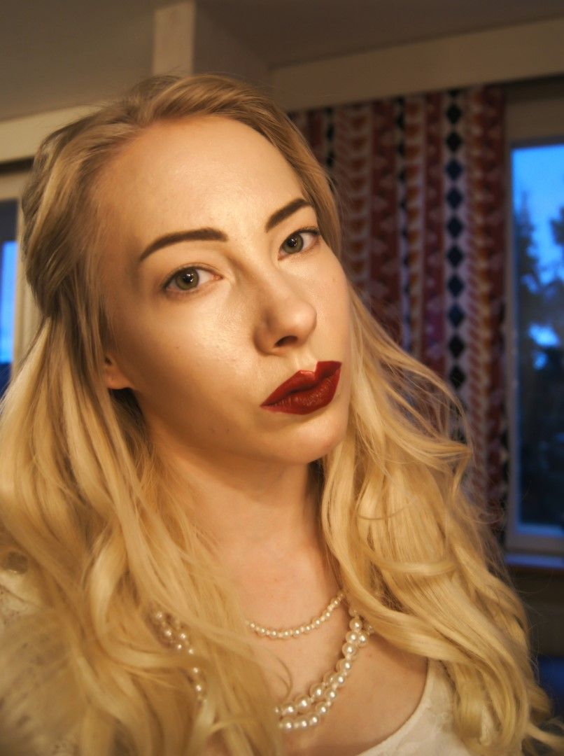 Basically what you need for this look are dark brows, bold red lips and a very light (pink) eye makeup. Bonus points for big blonde hair, or a wig.