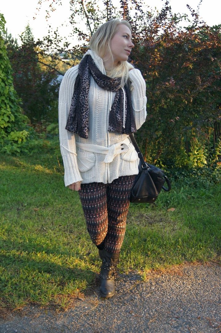 Print jeans: H&M, secondhand from a friend Knit: Object Boots: eBay Bag: Mango Scarf: Mango